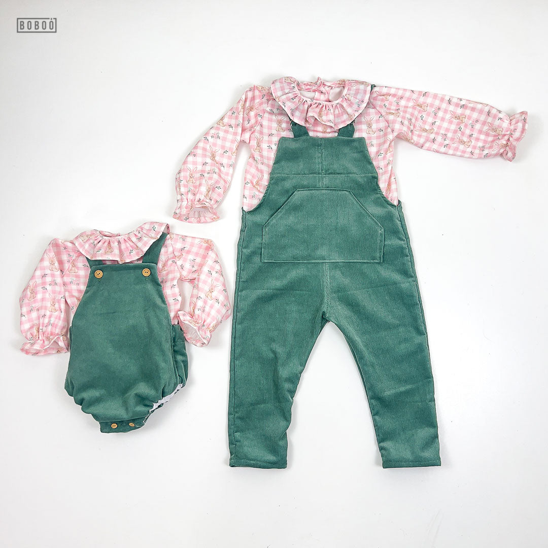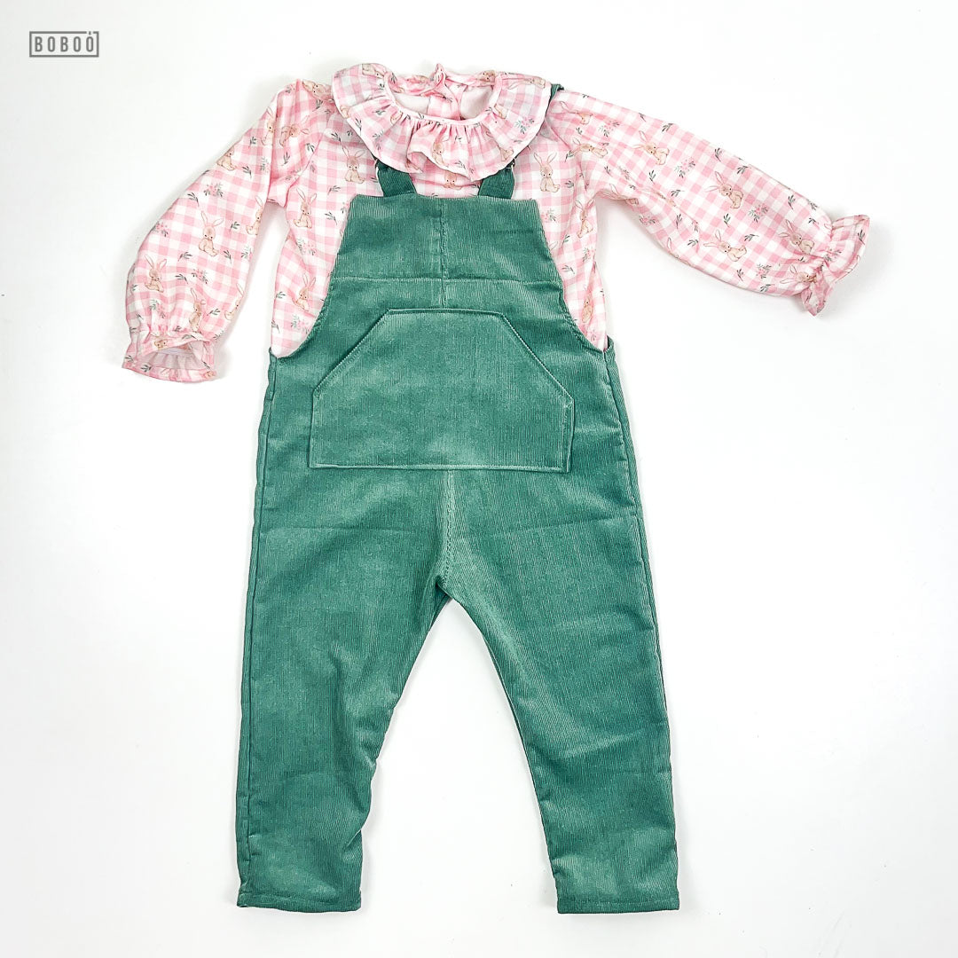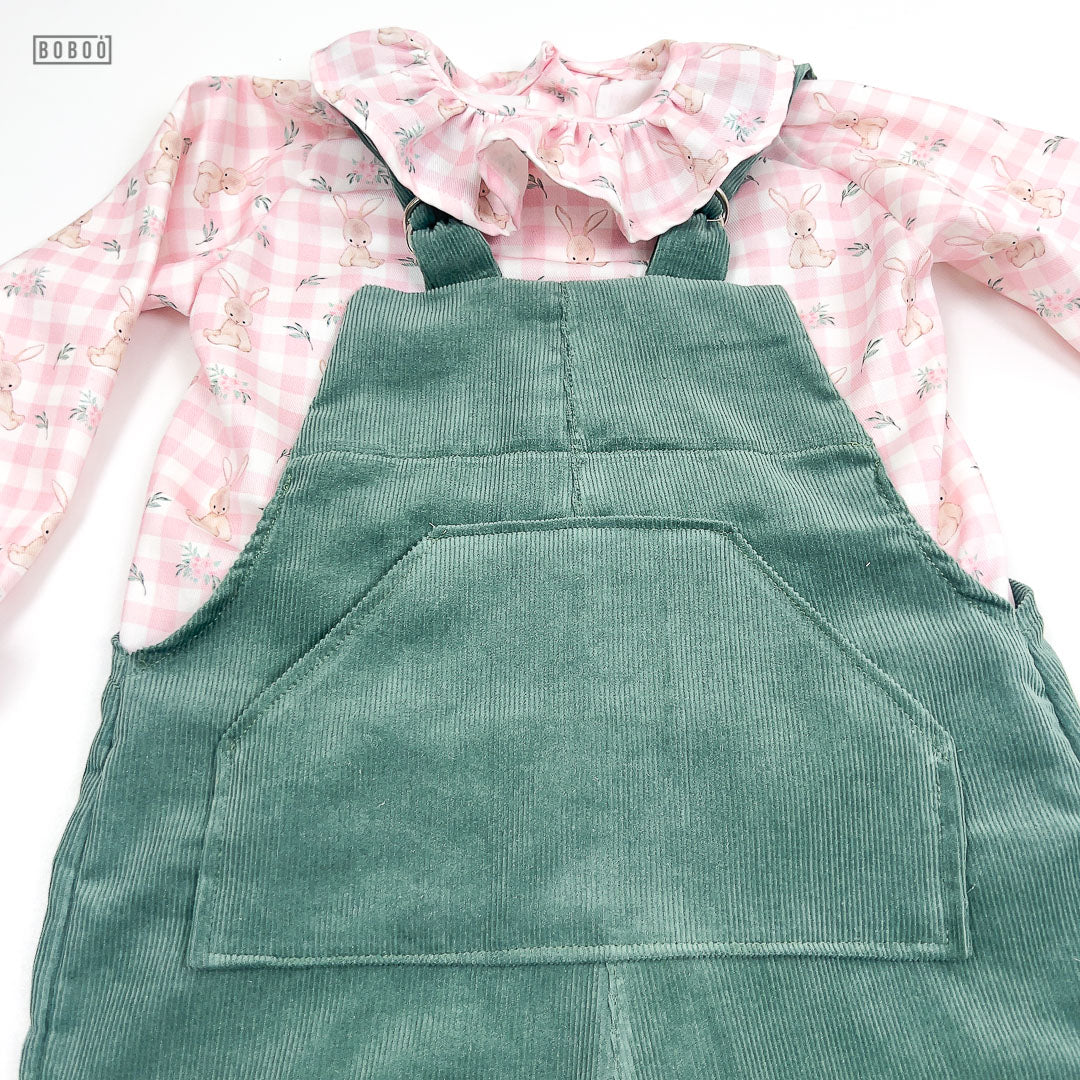 Peto Micropana en color verde Musgo. Con tirantes regulables y bolsillo delantero. Combínalo con la Blusa Vichy Conejito y crea un conjunto de lo más dulce. También disponible la Ranita Micropana Verde Musgo para llevar a los hermanit@s a juego.