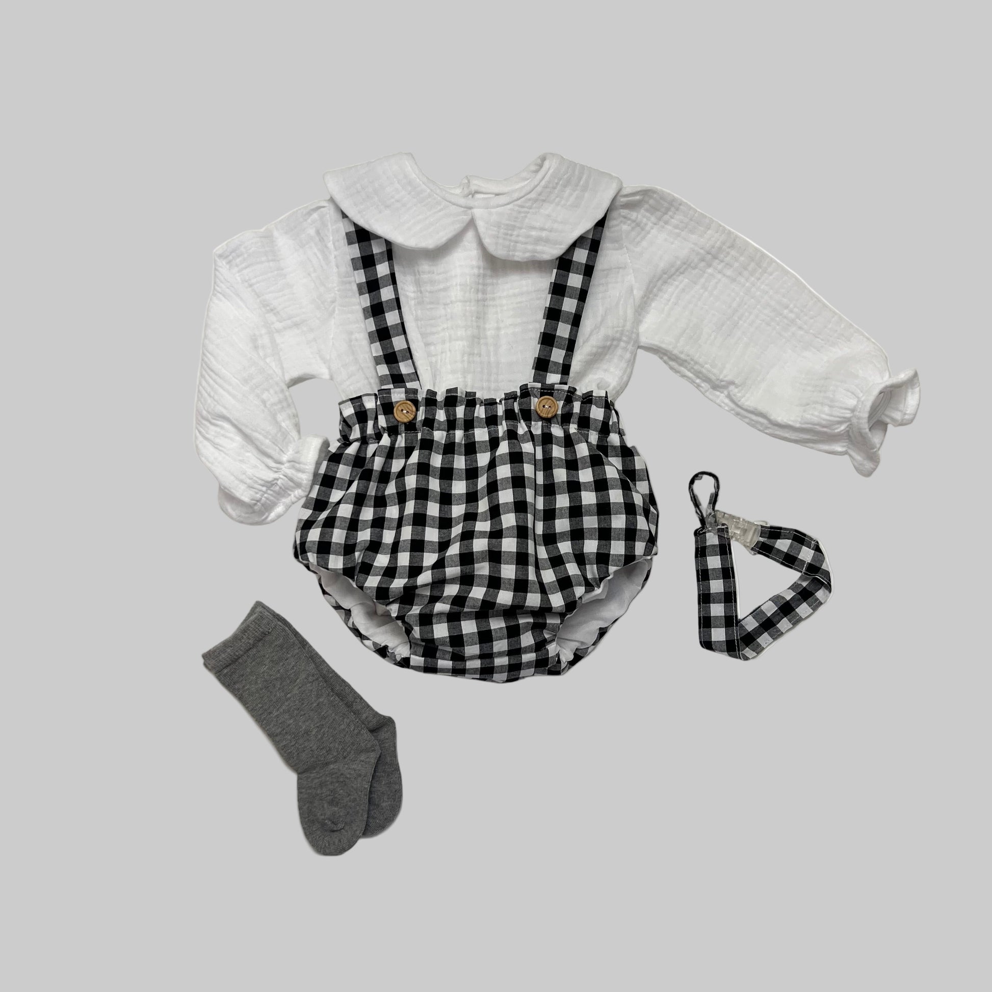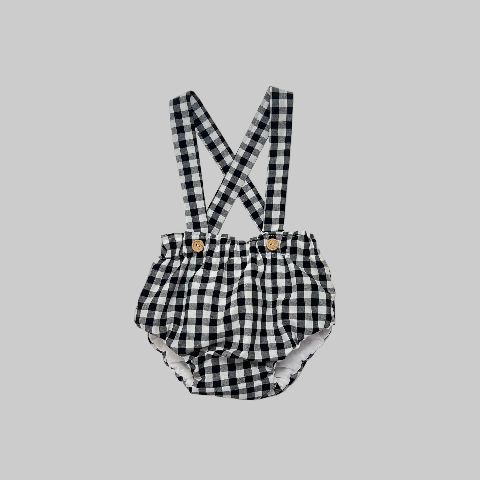 Cubrepañal con tirantes en tejido vichy, un básico en el armario de tu peque. Detalles de botones de madera.
